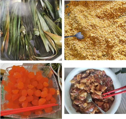 包粽子 备好材料之后,大家摩拳擦掌跃跃欲试,麻利地包起来了。卷粽叶、装糯米、裹粽叶、缠粽线....动作一气呵成,在一双双巧手下转眼变成了一个个诱人的粽子。